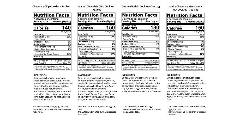 - Contains 6 - 7 ounce bags of cookies: chocolate Chip, Walnut chocolate Chip, oatmeal Raisin, white chocolate Macadamia Nut, Butter Crunch, coconut crisp