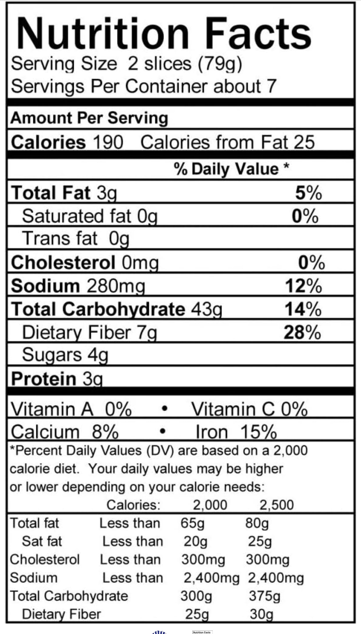 Water, brown rice flour, corn starch, tapioca starch, millet flour, sorghum flour, teff flour, eggs, corn dextrin, sugar, non-GMO canola oil, potato flour, honey, rice bran, sunflower seeds, sesame seeds, whole grain quinoa, whole grain teff, flax seeds, whole grain millet, amaranth flour, hemp seeds, baking powder, yeast, xantham gum, salt, vinegar enzymes (calcium sulfate and enzymes). NUTRITION FACTS Serving Size 2 Slices (68g) Servings per container 8 Amount per serving Calories 190 Calories from fat 25 %DV Total Fat 3g - 5% Saturated Fat 0g - 0% Trans Fat 0g Cholesterol 0mg Sodium 280mg - 12% Total Carbohydrates 43g - 14% Dietary Fiber 7g - 28% Sugars 4g Protein 3g Vitamin A 0% Vitamin C 0% Calcium 8% Iron 15% Contains: Eggs