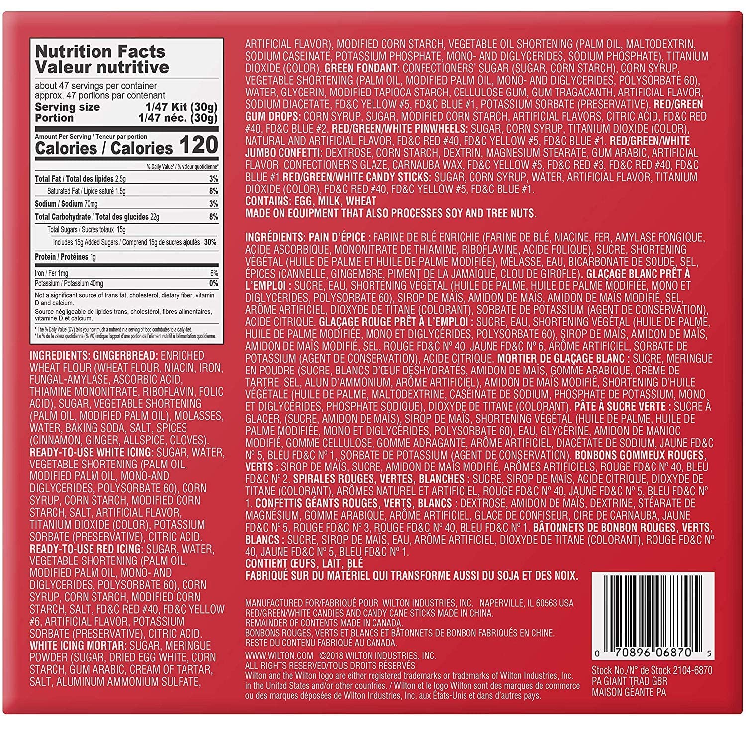 By Wilton, kit contains everything you need for decorating including unassembled panels, 4 types of candies, Fun Holiday Stickers, white and red ready-to-use icing, green fondant, colorful presentation board, 2 decorating bags and 2 tips, plus a helpful instruction sheet.
