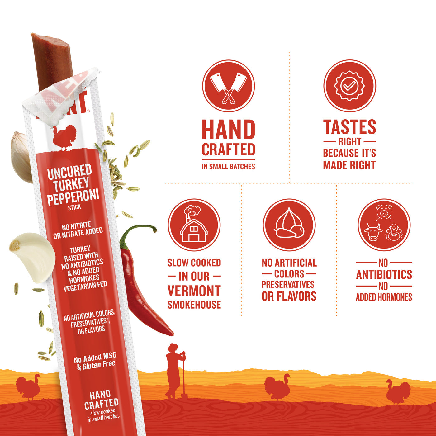 Our Uncured Pepperoni Turkey Stick features paprika, fennel and garlic for a satisfying snack with classic pepperoni flavor this is one of our top sellers.