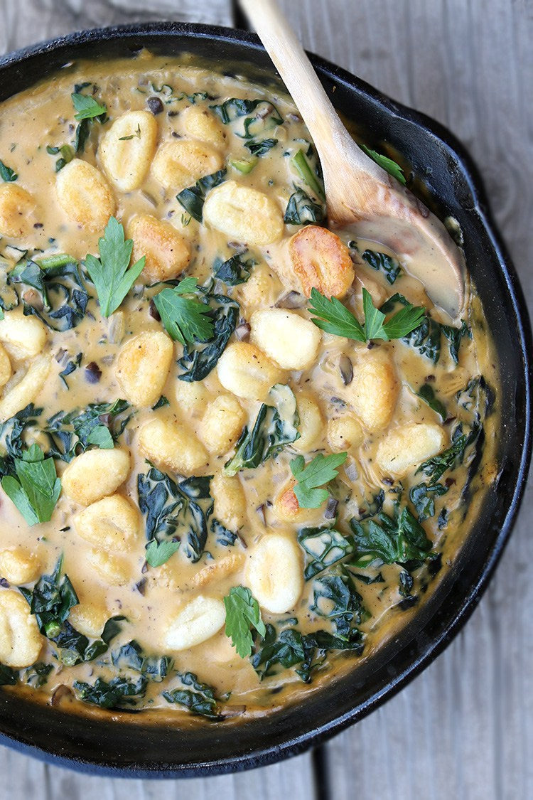 - Heat 1 tbsp butter over medium high heat in a large nonstick or cast iron skillet, and add the cooked gnocchi. Let cook until the bottoms are golden brown, and then flip to brown the other side. (This step is entirely optional, but I really like the golden crust the gnocchi get when cooked this way!) Once browned, removed from the skillet.
