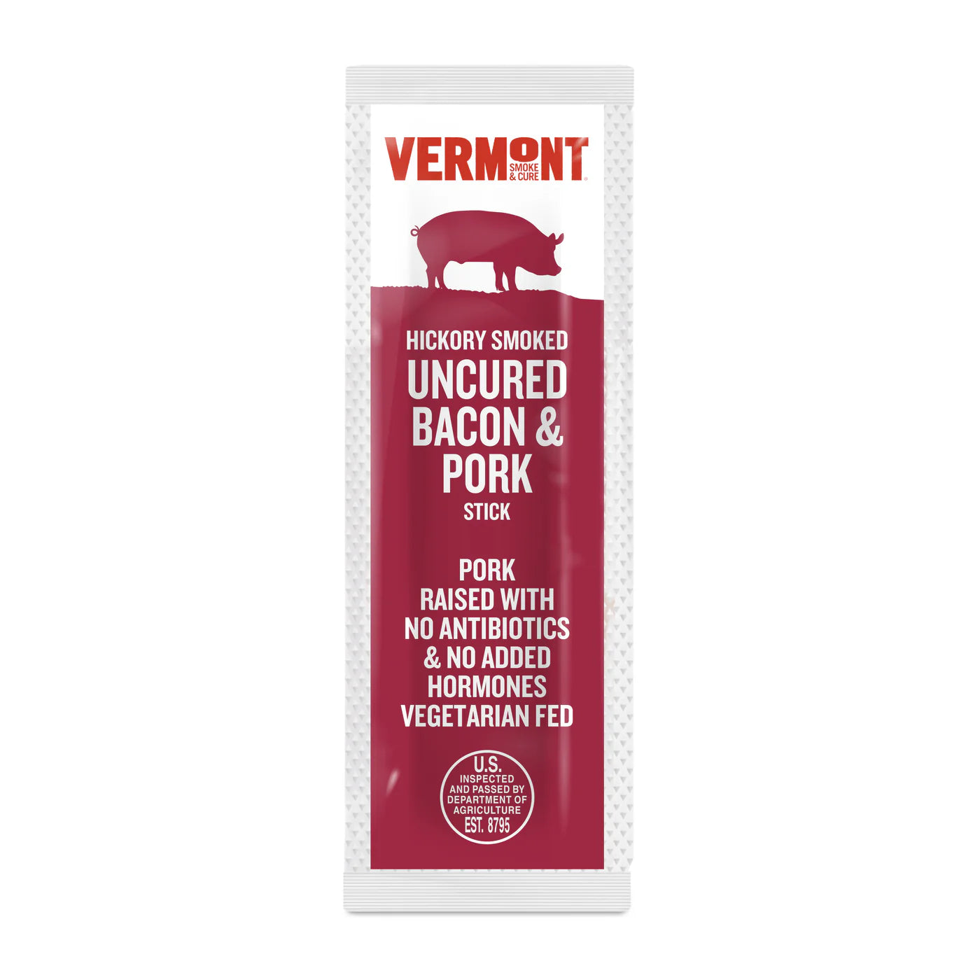 Hickory Smoked Uncured Bacon Pork Sticks Ingredients: PORK, UNCURED BACON- NO ADDED NITRATES OR NITRITES† (PORK, WATER, SEA SALT, TURBINADO SUGAR, CULTURED CELERY POWDER*, MAPLE SYRUP), SEA SALT, LESS THAN 2% OF MAPLE SUGAR, CULTURED CELERY POWDER*, CHERRY POWDER, SUGAR, CELERY POWDER*, LACTIC ACID STARTER CULTURE (NOT FROM MILK), SPICES. ENCASED IN COLORED BEEF COLLAGEN CASING. *TO SUPPORT QUALITY