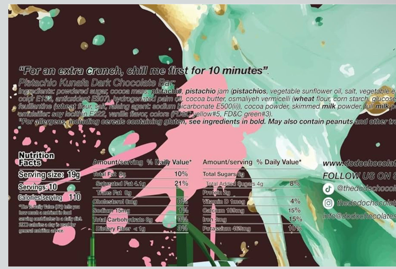Powdered sugar, cocoa mass, pistachio, pistachio jam (pistachios, vegetable sunflower oil, salt, vegetable extracts, color E133, antioxidant E307), hydrogenated palm oil, cocoa butter, osmaliyehvermicelli (wheat flour, corn starch, glucose syrup), teullantine (wheat flour, salt, raising agent: sodium bicarbonate E500(ii)), cocoa powder, skimmed milkpowder, full milk powder, emulsifier: soy lecithin E322, vanilla flavor, colors (FD&C yellow#5, FD&C green#3)
